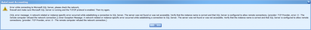 AutoCount unable login with “Error while connecting to Microsoft SQL Server….”