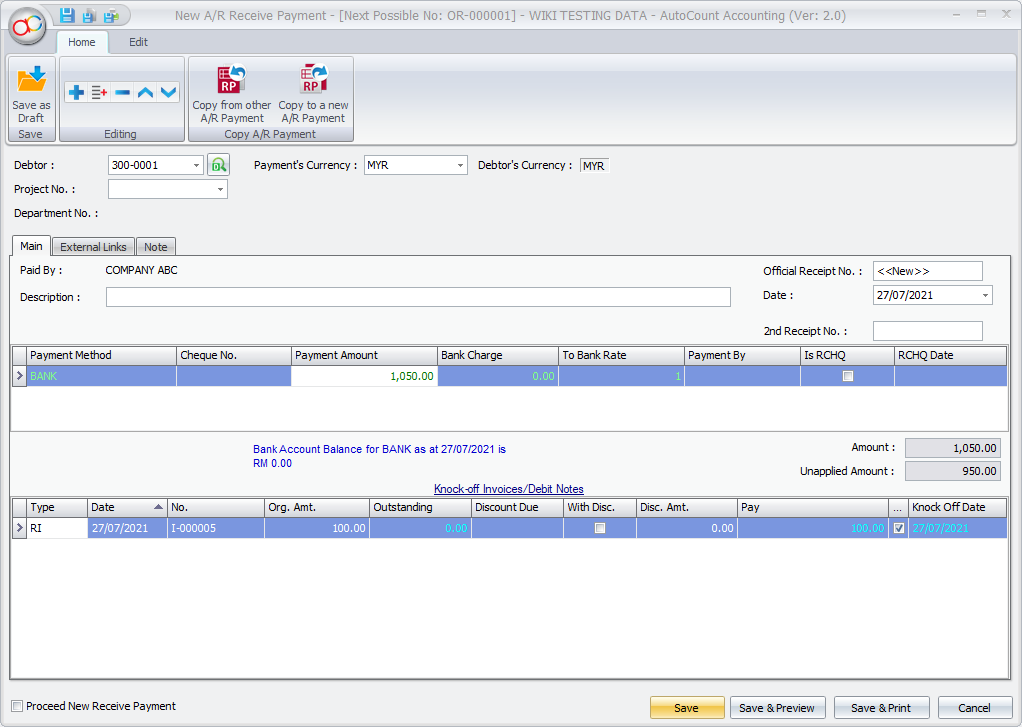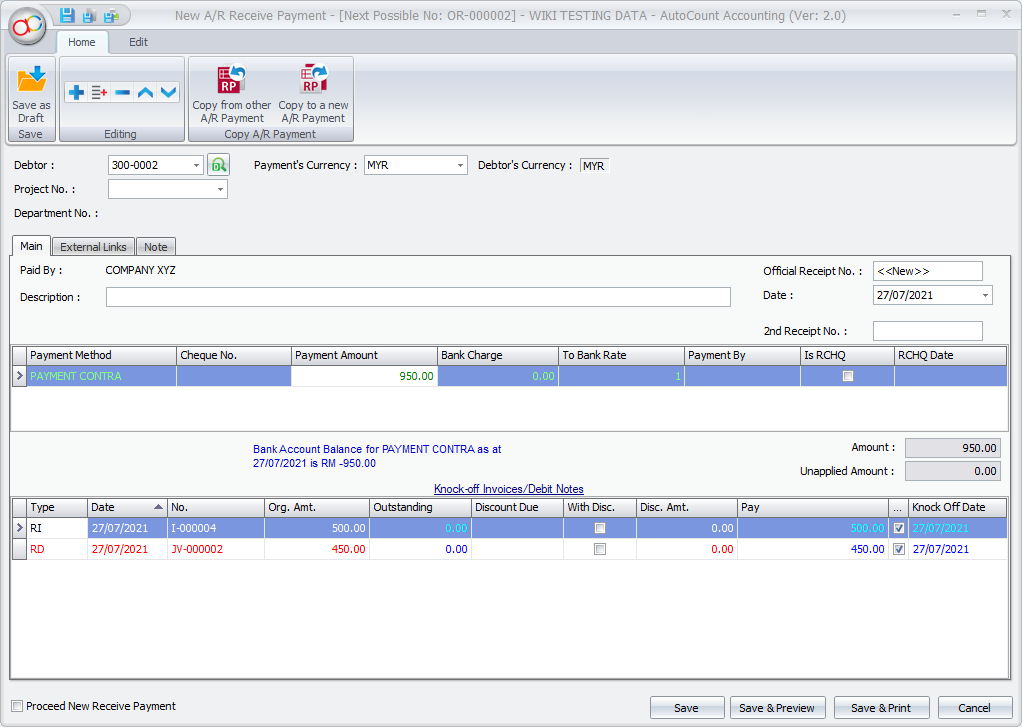 Create a OR for Company XYZ and select “Payment Contra” as Payment method, continue knock off Company XYZ outstanding.
