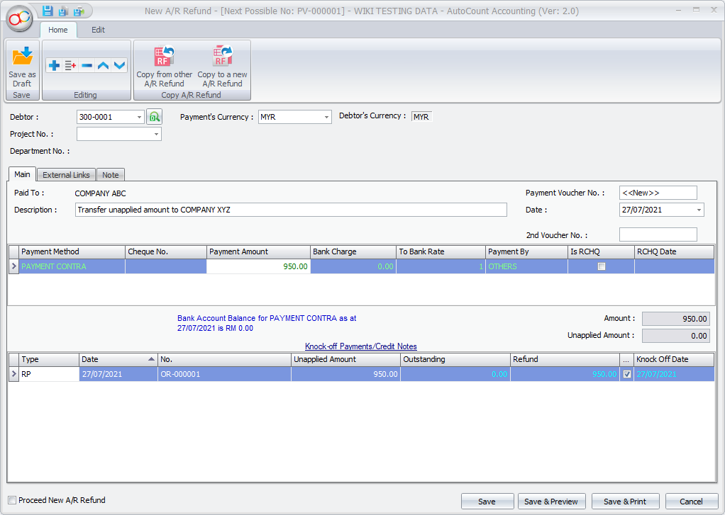 Create a new refund for Company ABC and select “Payment Contra” as Payment method and knock off the OR.
