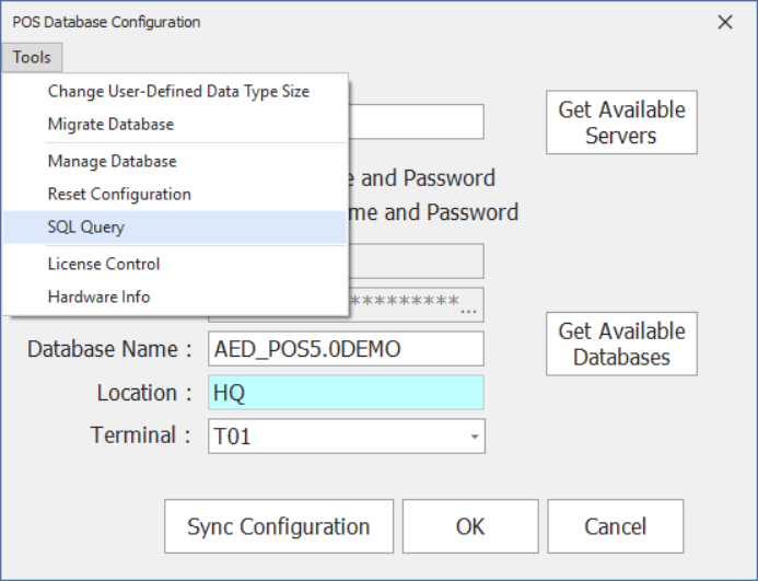 Go to C:\Program Files (x86)\AutoCount\POS 5.0\ , open PosConfig.exe, click Tools > SQL Query